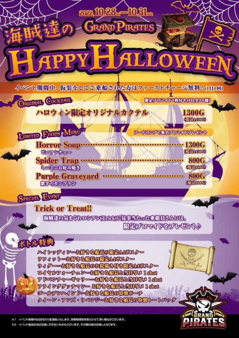 ヨーホー お待たせしました以下、イベントの詳細です HALLOWEEN EVENT20222022年10月28日(金)~31日(月) イベント期間中、仮装をして乗船された方はファーストチャージ無料(1日1回) イベントカクテル 1300G(1430G)限定ブロマイド1枚付き(1日全10種) 限定メニュー Horror Soup 1300G(1430G)∟ビーフシチュー Spider Trap 800G(880G)∟ミニミニお好み焼き Purple Graveyard 800G(880G)∟紫芋のモンブラン フードコンプで集合ブロマイドプレゼント ボトル特典ハイレッディン…お好きな船長の限定A4ポスターラフィット…お好きな船長の限定A4ポスターウィダー…お好きな船長のお絵描き付き限定A4ポスターロイヤルフォーチュン…お好きな船長と当日写メ1shotアドベンチャーギャリー…お好きな船長と当日写メ1shotフライングダッチマン… お好きな船長と当日写メ1shotゴールデンハインド…お好きな船長の特製ポーチクイーン・アンズ・リベンジ…お好きな船長の特製トートバッグ 突発お楽しみ会Trick or Treat!!海賊達の気まぐれロシアン(Trick)に見事当たった乗組員さんには、限定ブロマイドをプレゼント イベント期間中の船長達の仮装にも注目 今年もハロウィンパーティを一緒に楽しみませんか 皆の乗船、待ってるよー