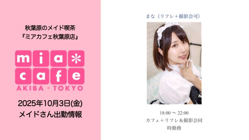★#メイドカフェ ・ミアカフェ #秋葉原 店★ ☕️営業予定日☕️ 🎀10月3日(金) 18-22 まな 🎀10月4日(土)【🎂いおり・はる 合同周年祭🎂】  12-17 いおり、はる  17-22 くら、まな  リラ&フォトお呼び出し出勤 みれい 🎀10月5日(日)【🎂いおり・はる 合同周年祭🎂】  12-17 いおり、はる https://t.co/LKzdHh17fL