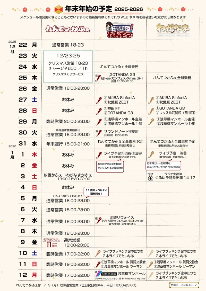 | å¶æ¥æé | å¹³æ¥ 18ïŒ00ã23ïŒ00ïŒã©ã¹ããªãŒããŒ22ïŒ30ïŒ åæ¥ç¥ äžå®æå¶æ¥(Twitterã«ãŠæ å ±æŽæ°) https://twitter.com/renketsutetsudo ä¹åå¡ã®ã·ããã¯WEBãã確èªé ããŸãã https://rentetsu.net/shift/ | ||||||||||||||