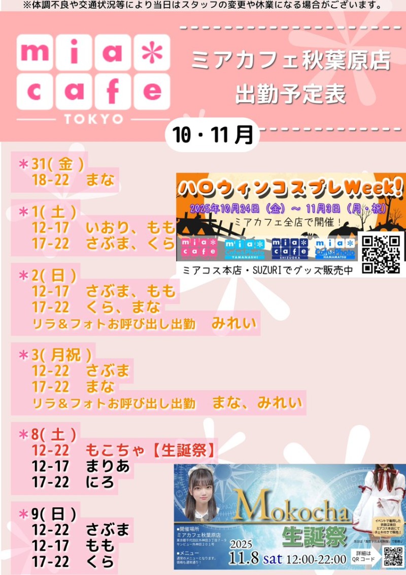 ★メイドカフェ・ミアカフェ秋葉原店★ ☕️営業予定日☕️ 🧙‍♀️#ハロウィン フリー #コスプレ 🧙‍♀️ 🎃10月31日(金)  18-22 まな 🎃11月1日(土)  12-17 いおり,もも  17-22 くら,さぶま 🎃11月2日(日)  12-17 さぶま,もも  17-22 くら,まな  リラ&フォトお呼び出し出勤 みれい 🎃11月3日(月祝) https://t.co/Bs7lKtlMgR