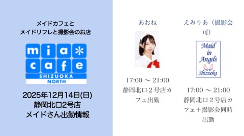| 営業時間 | 静岡店は出勤スタッフがいれば営業です! 基本的に 12時~22時が営業時間です! ●静岡店のツイッター @shizuokamaidsan https://twitter.com/shizuokamaidsan ●ミア静岡店の営業曜日&営業時間● ☆月〜木 14:00〜22:00(最終受付20:00) ☆金曜日 12:00〜22:00(最終受付21:00) ☆土・日・祝 12:00〜22:00(最終受付21:00) 営業時間外はオンライン予約にてお願いいたします。 PC・携帯共通 → http://m-kanzume.moo.jp/yoyaku2/user.cgi ●ミアガイド出勤状況● スマホ・PC → 後日公開予定 ★静岡店スタッフによるミア甲府店でのメイドカフェリアル営業★ ☆不定期 サイトにてご確認ください。 http://market.chu.jp/schedule1/sche37.cgi | ||||||||||||||